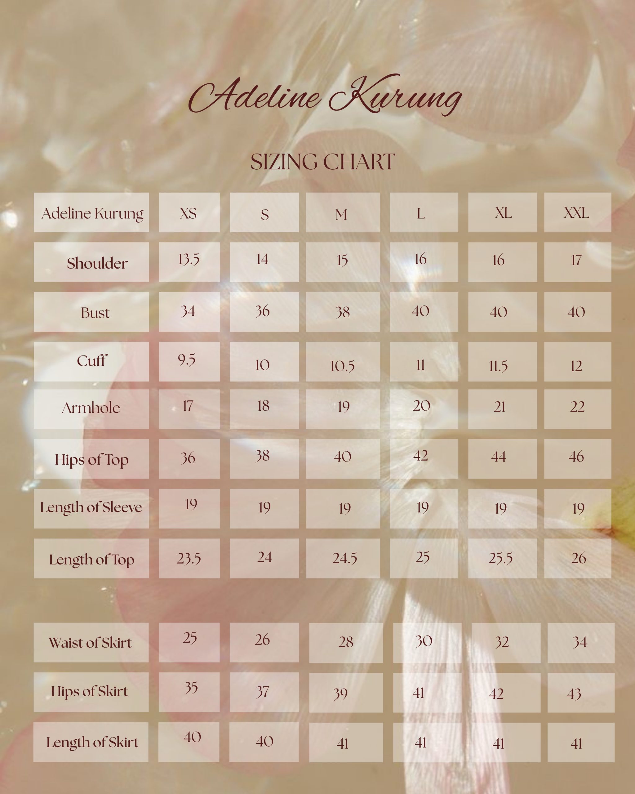 | Measurements | XS | S | M | L | XL | XXL |