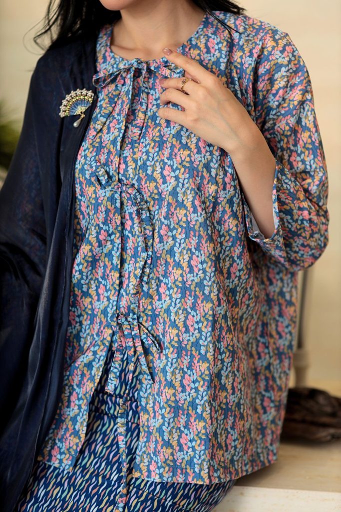 Paired with a matching cotton skirt, the set falls neatly and comfortably when worn. The skirt is designed for ease and practicality, offering a smooth drape that complements the relaxed top. The coordinated prints and soft colour palette create a timeless, harmonious look suitable for both festive and casual occasions.