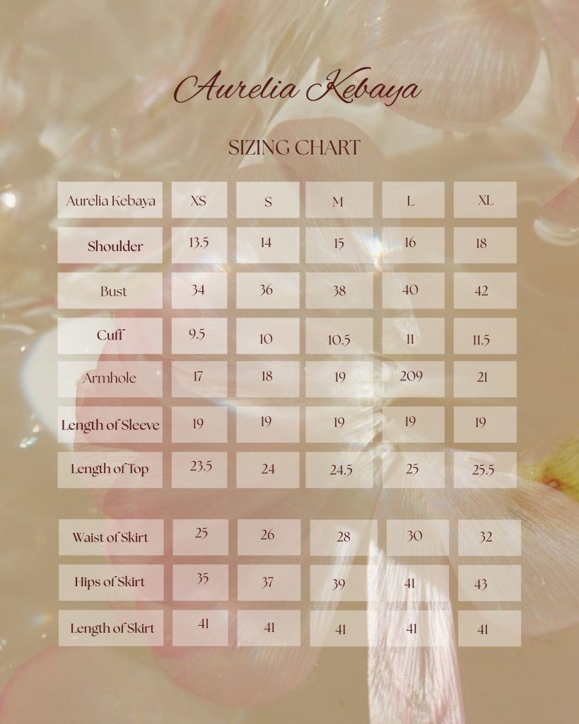 Aurelia Kebaya features a modern kebaya-inspired kurung designed with a soft, feminine approach. The top is made from lightweight, breathable fabric with a smooth finish that drapes beautifully on the body. Its floral print adds a d elicate charm, while the structured neckline and front detailing create a neat, polished appearance when worn. The slightly flared cut gives a flattering flow, allowing comfortable movement without losing its elegant shape.