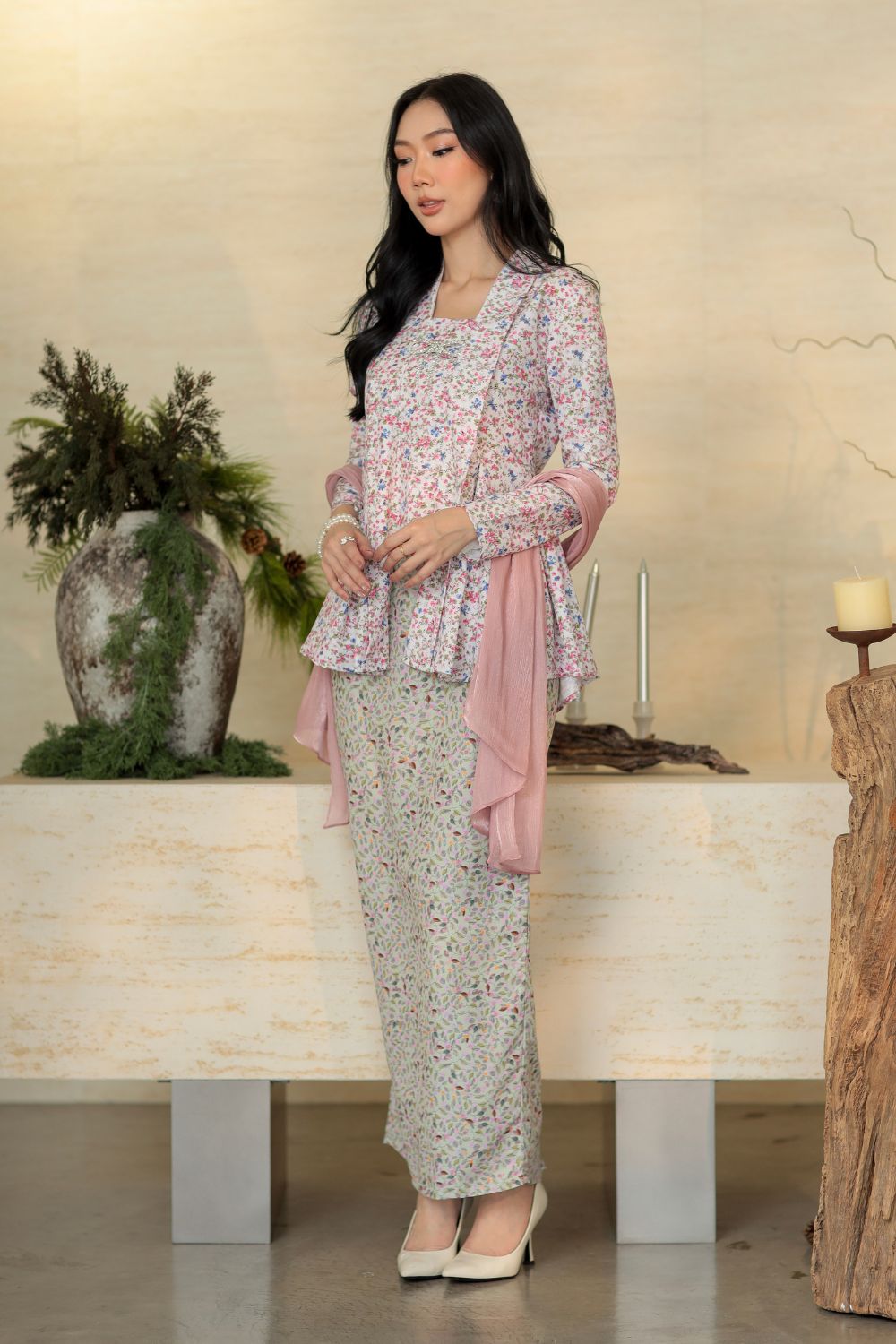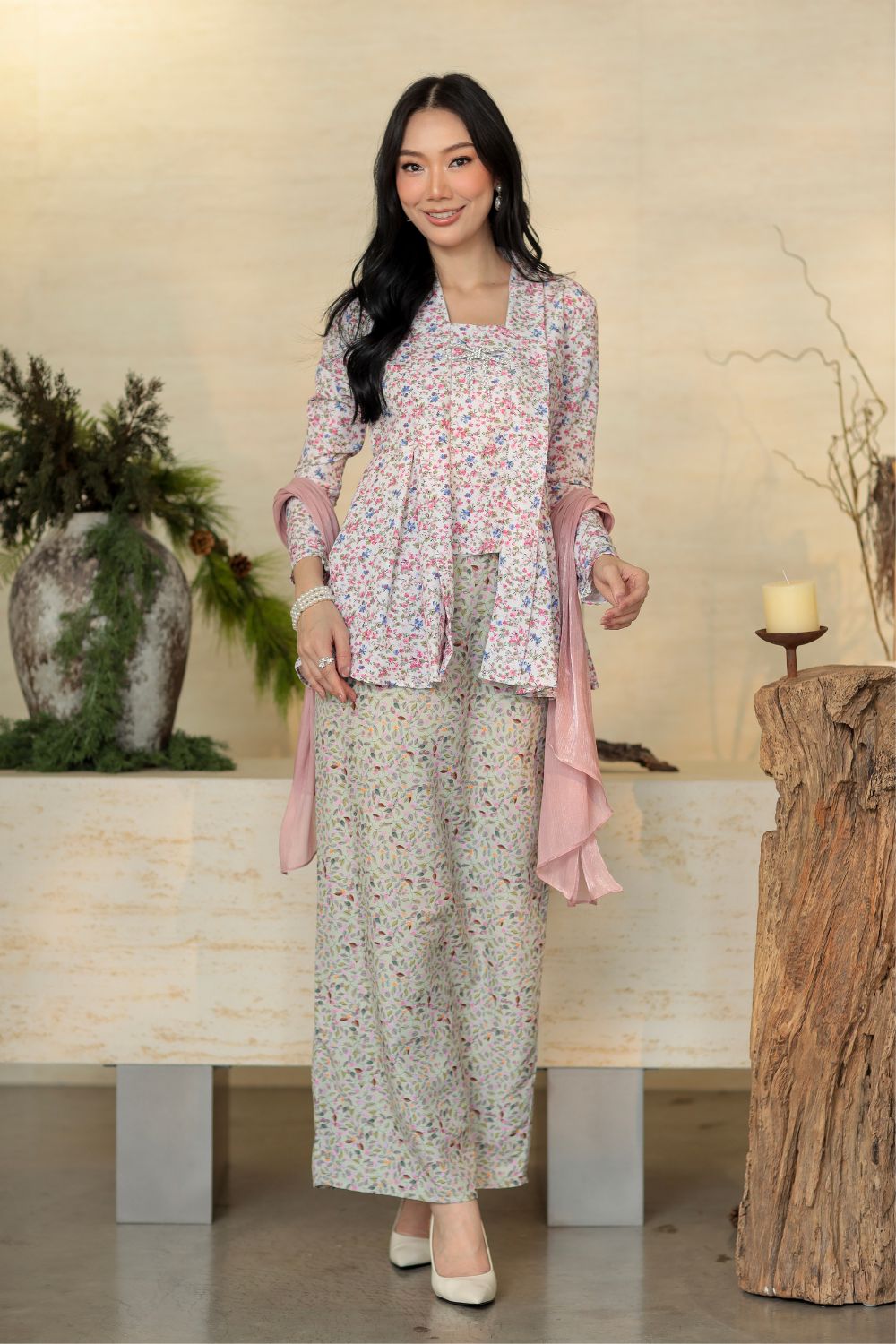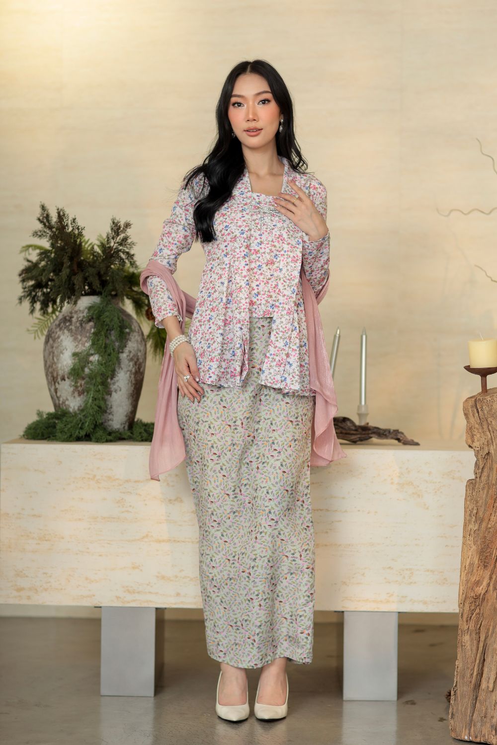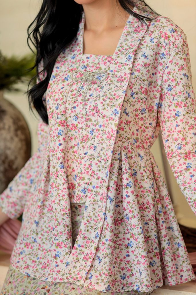 Aurelia Kebaya features a modern kebaya-inspired kurung designed with a soft, feminine approach. The top is made from lightweight, breathable fabric with a smooth finish that drapes beautifully on the body. Its floral print adds a d elicate charm, while the structured neckline and front detailing create a neat, polished appearance when worn. The slightly flared cut gives a flattering flow, allowing comfortable movement without losing its elegant shape.