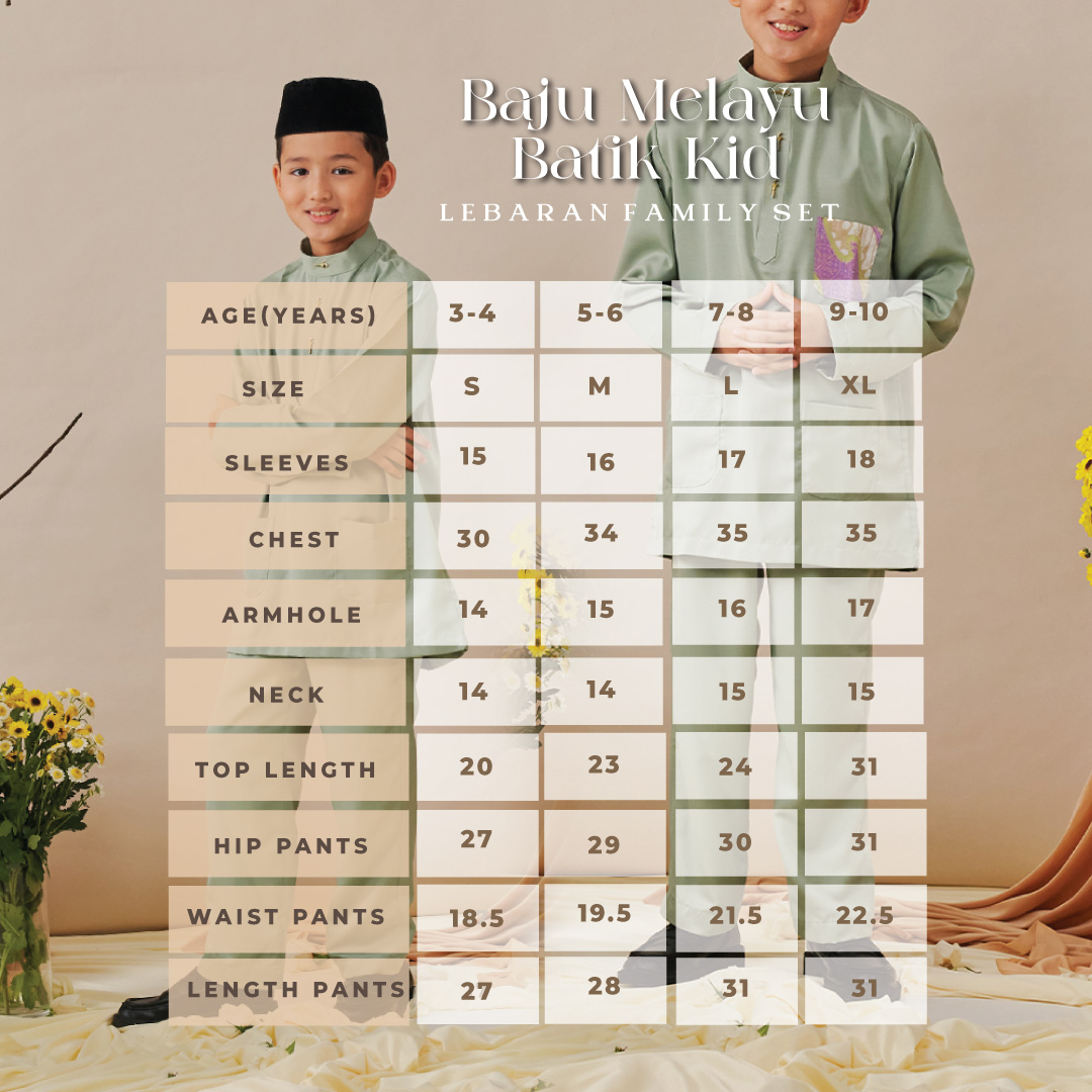 | BAJU MELAYU BATIK | 3-4 YEARS (S) | 5-6 YEARS (M) | 7-8 YEARS (L) | 9-10 YEARS (XL) |