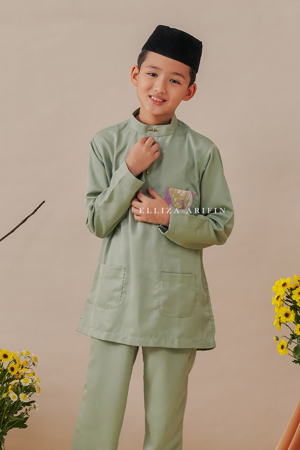 Baju Melayu Batik Kids in Sage Green