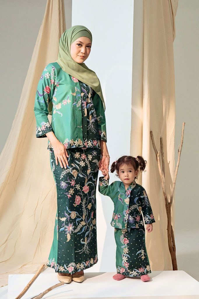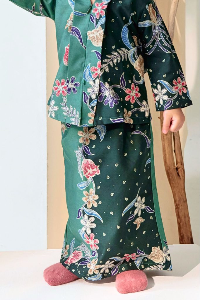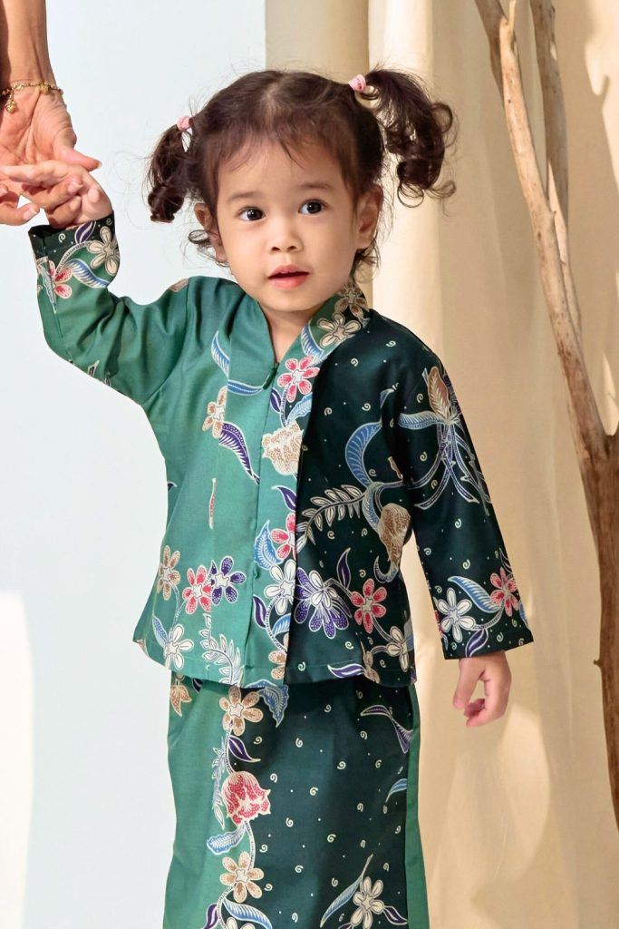 Featuring a classic kebaya silhouette with a gentle neckline and a relaxed, comfortable fit, it comes paired with a matching skirt that supports active play without compromising modesty. The soft prints and coordinated colour palette give it a timeless charm, making it perfect for festive occasions and meaningful family gatherings.