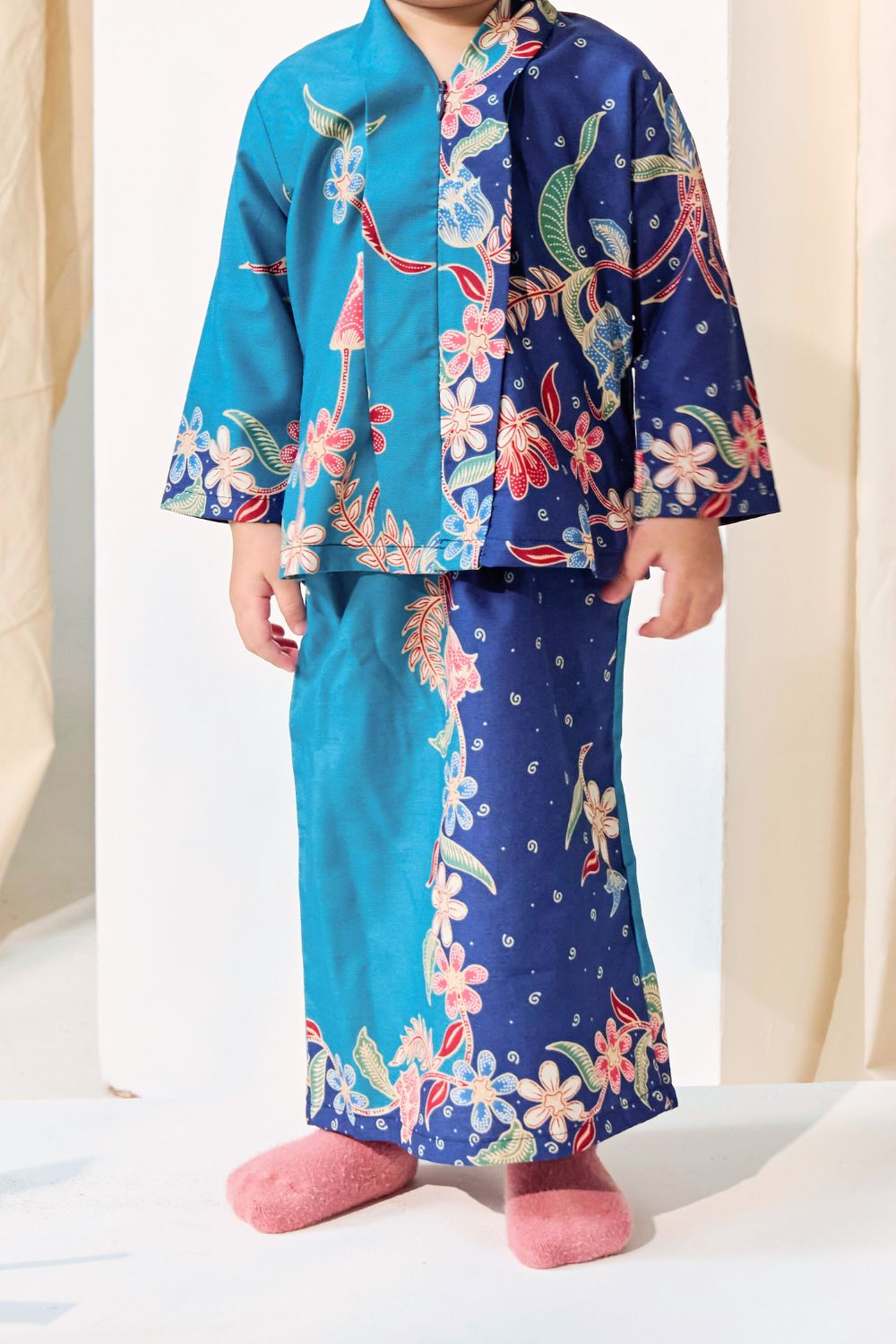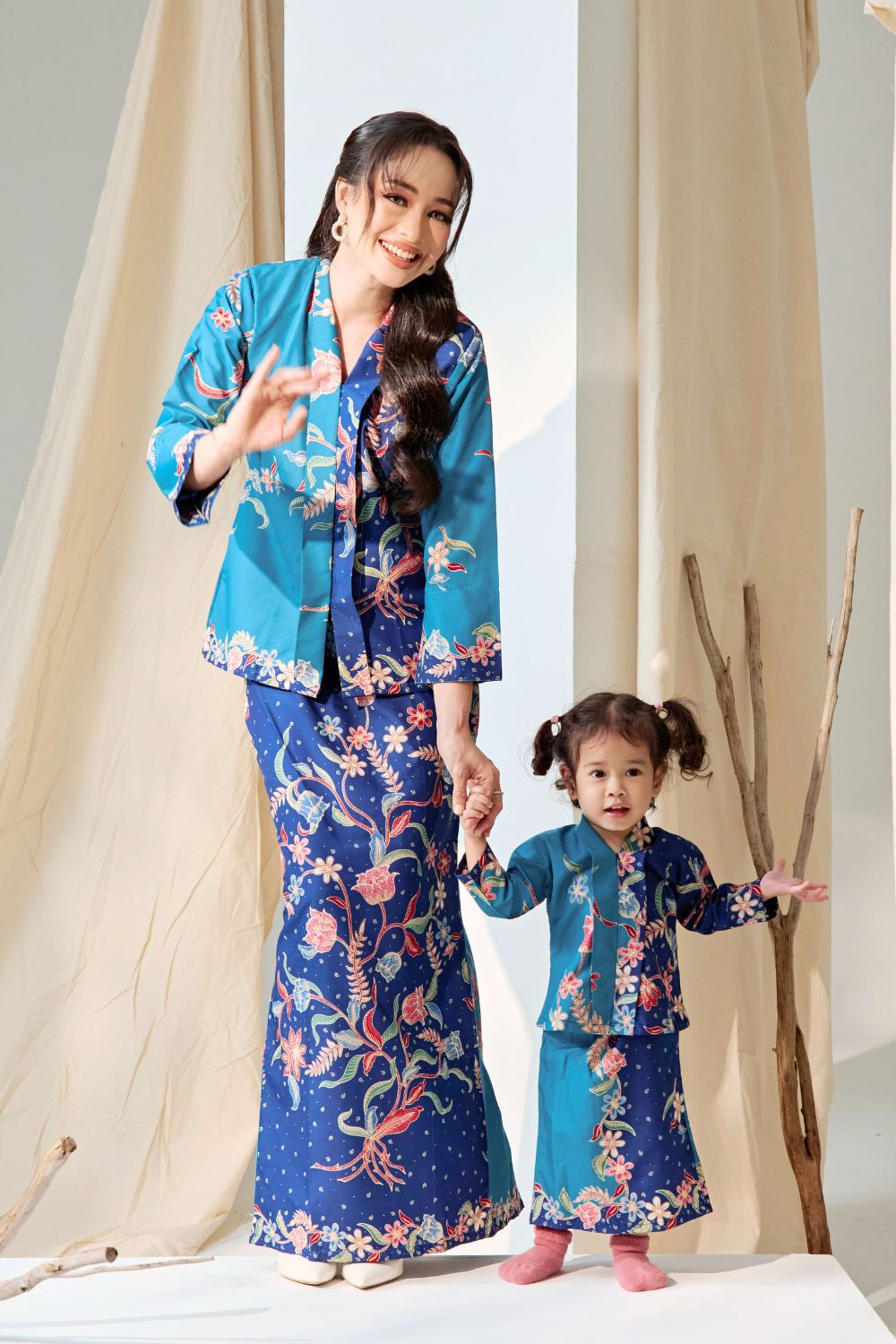 Featuring a classic kebaya silhouette with a gentle neckline and a relaxed, comfortable fit, it comes paired with a matching skirt that supports active play without compromising modesty. The soft prints and coordinated colour palette give it a timeless charm, making it perfect for festive occasions and meaningful family gatherings.