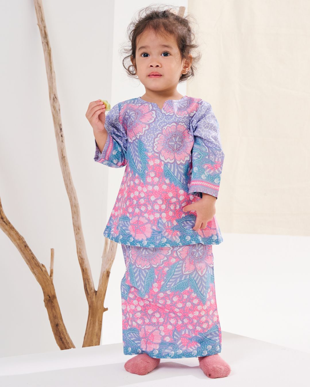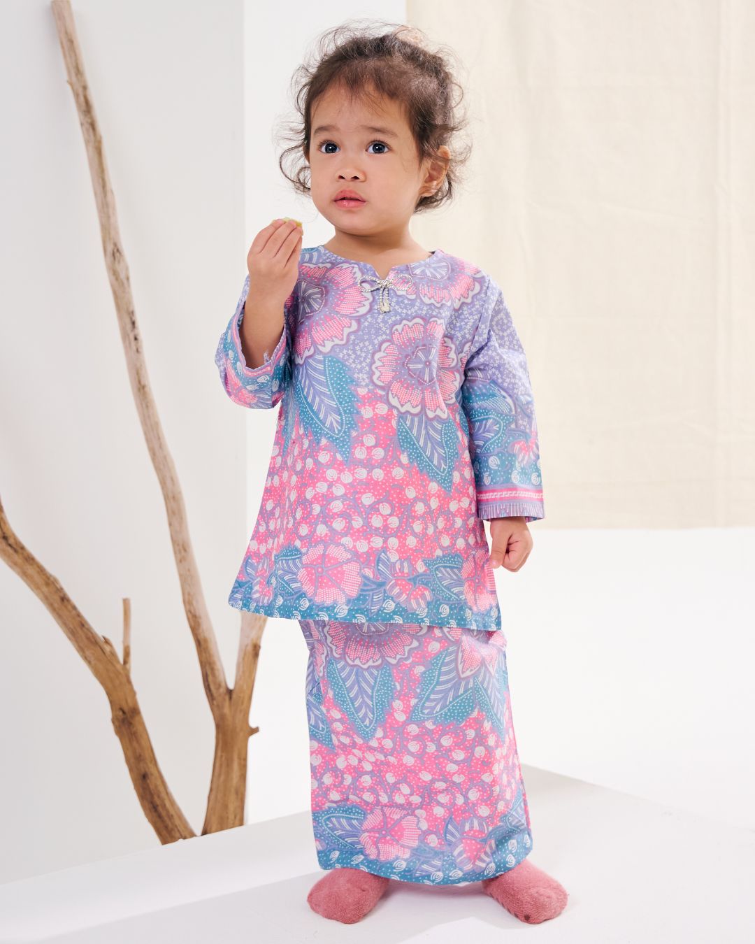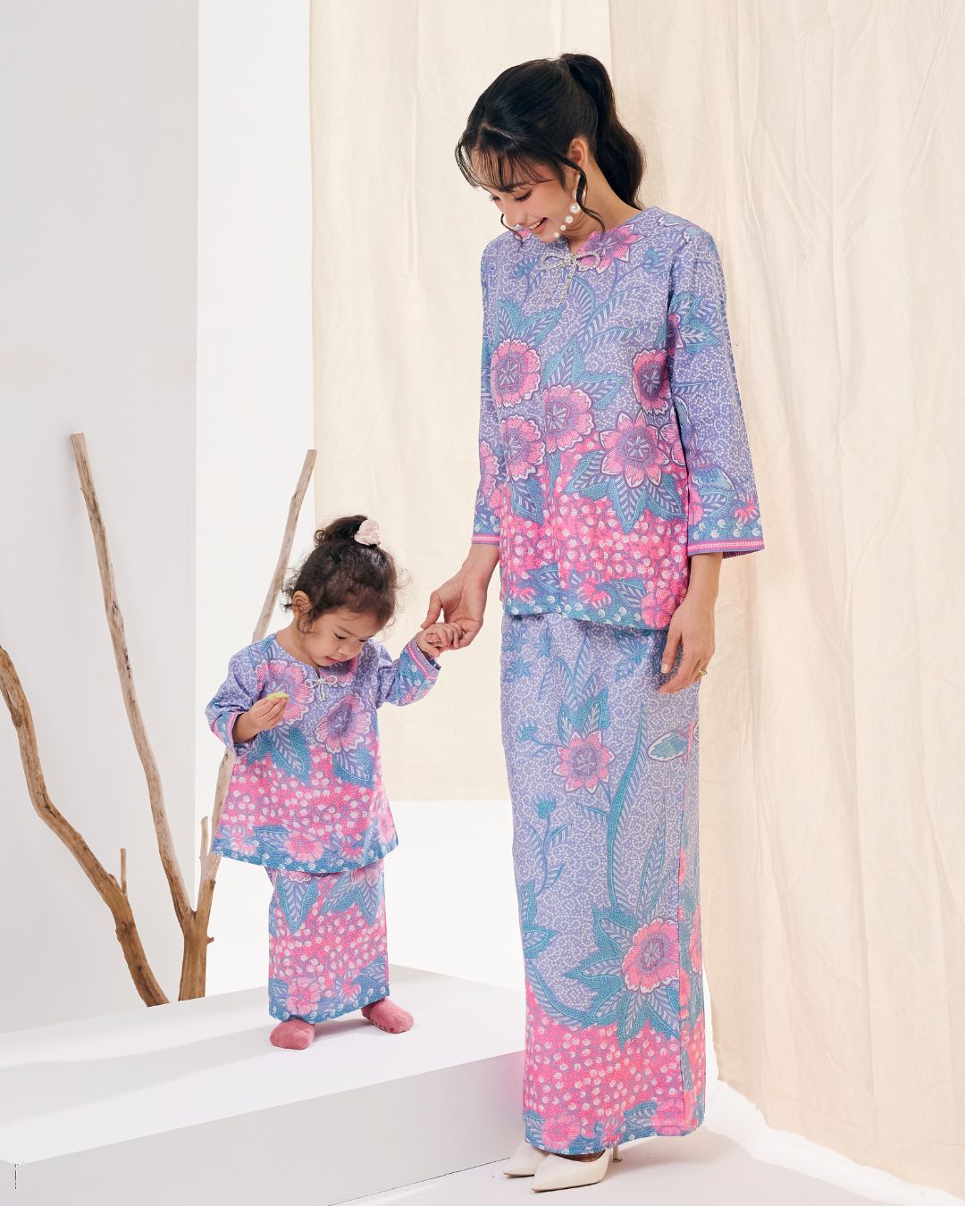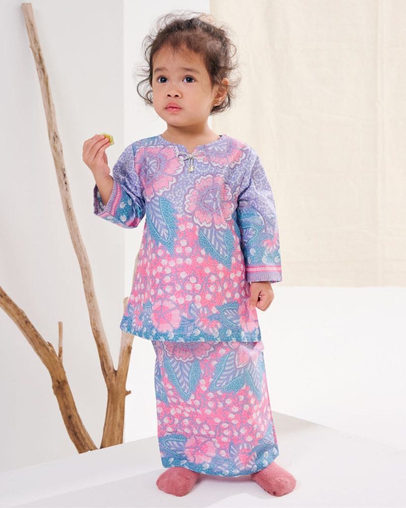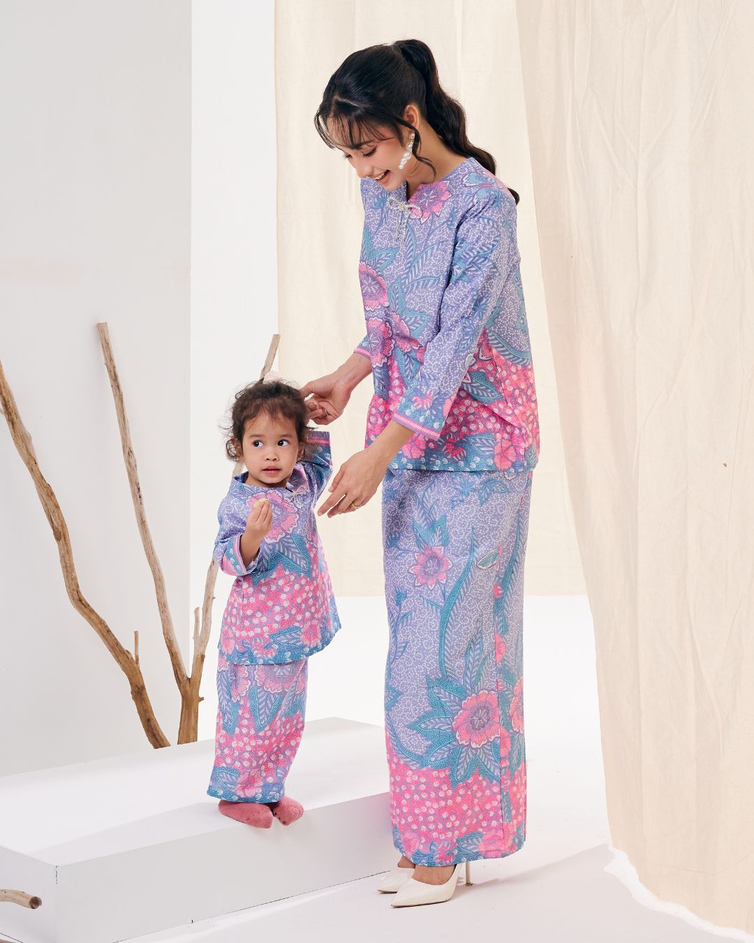 Adorned with beautifully detailed batik motifs and a harmonious colour palette, this Serina Kurung Kids is designed to shine during festive celebrations, family gatherings, and meaningful occasions. The comfortable matching skirt offers ease of movement while preserving modest elegance.