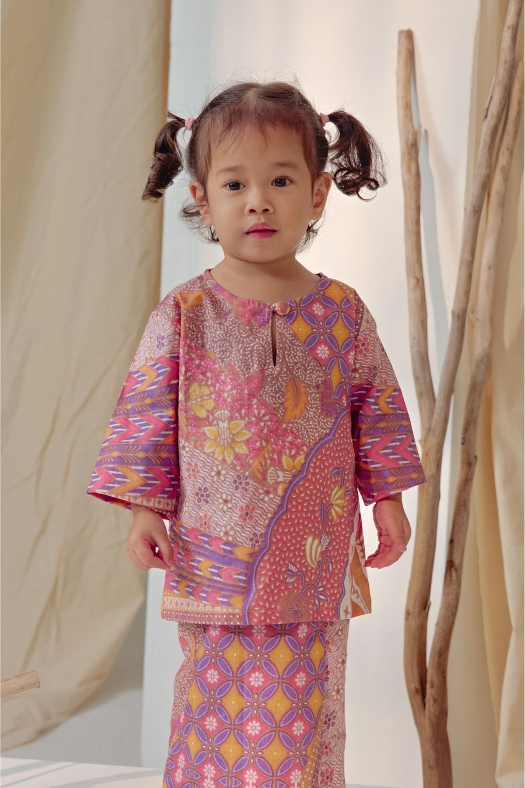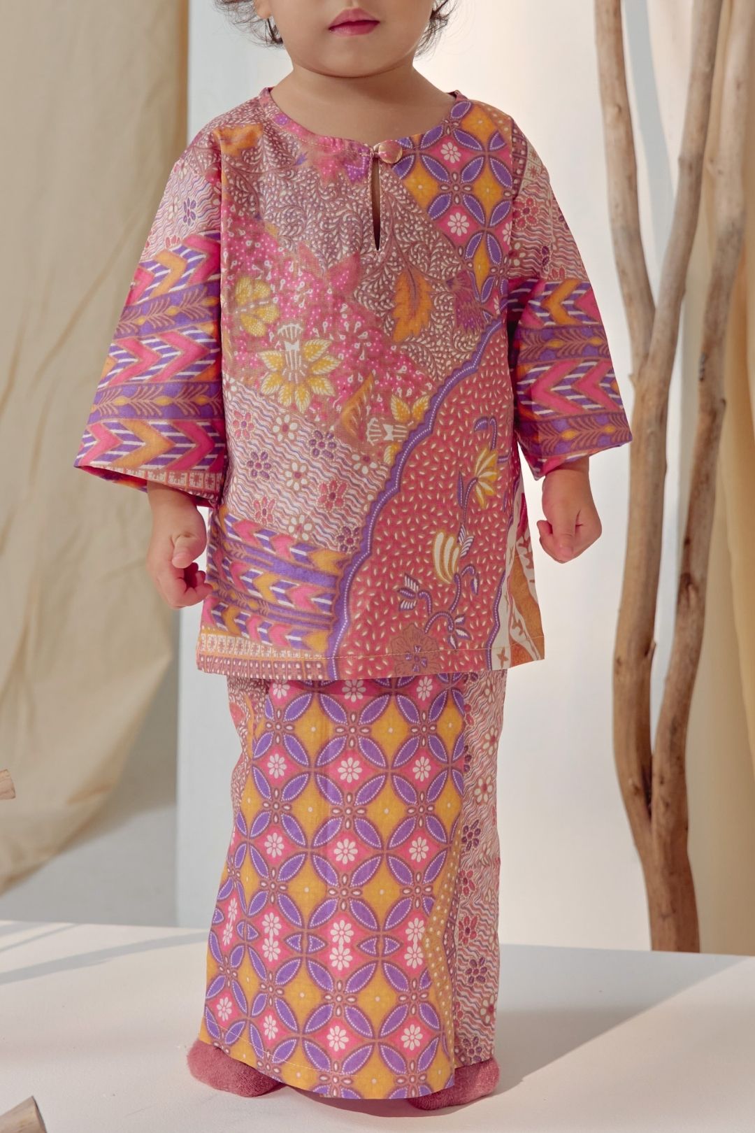 Featuring a classic kurung silhouette with a soft neckline and comfortable fit, it is paired with a matching skirt that allows for playful movement without compromising modesty. The delicate prints and harmonious colour palette create a timeless look, perfect for festive celebrations and special family moments.