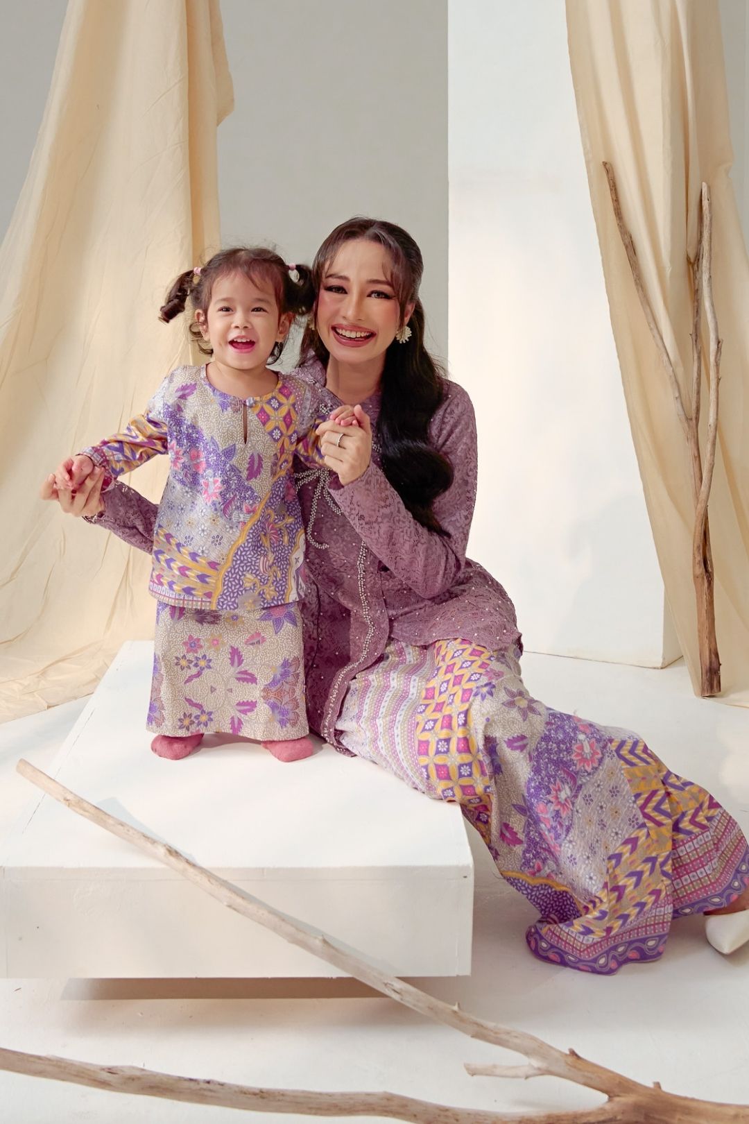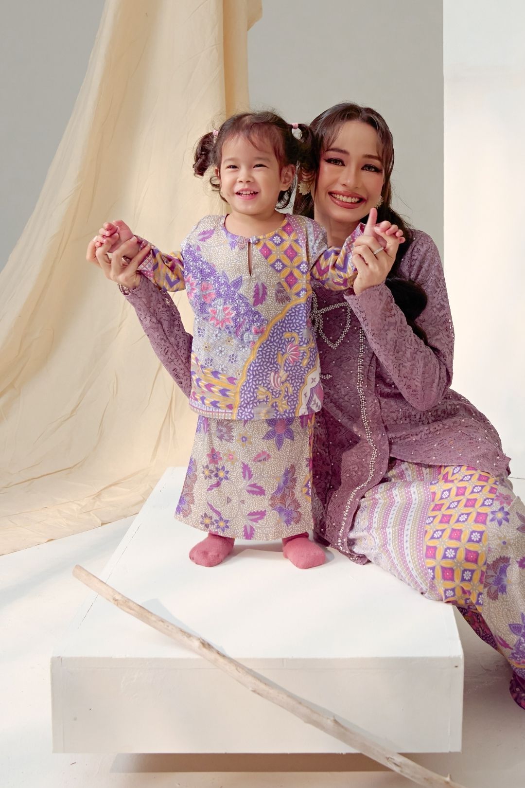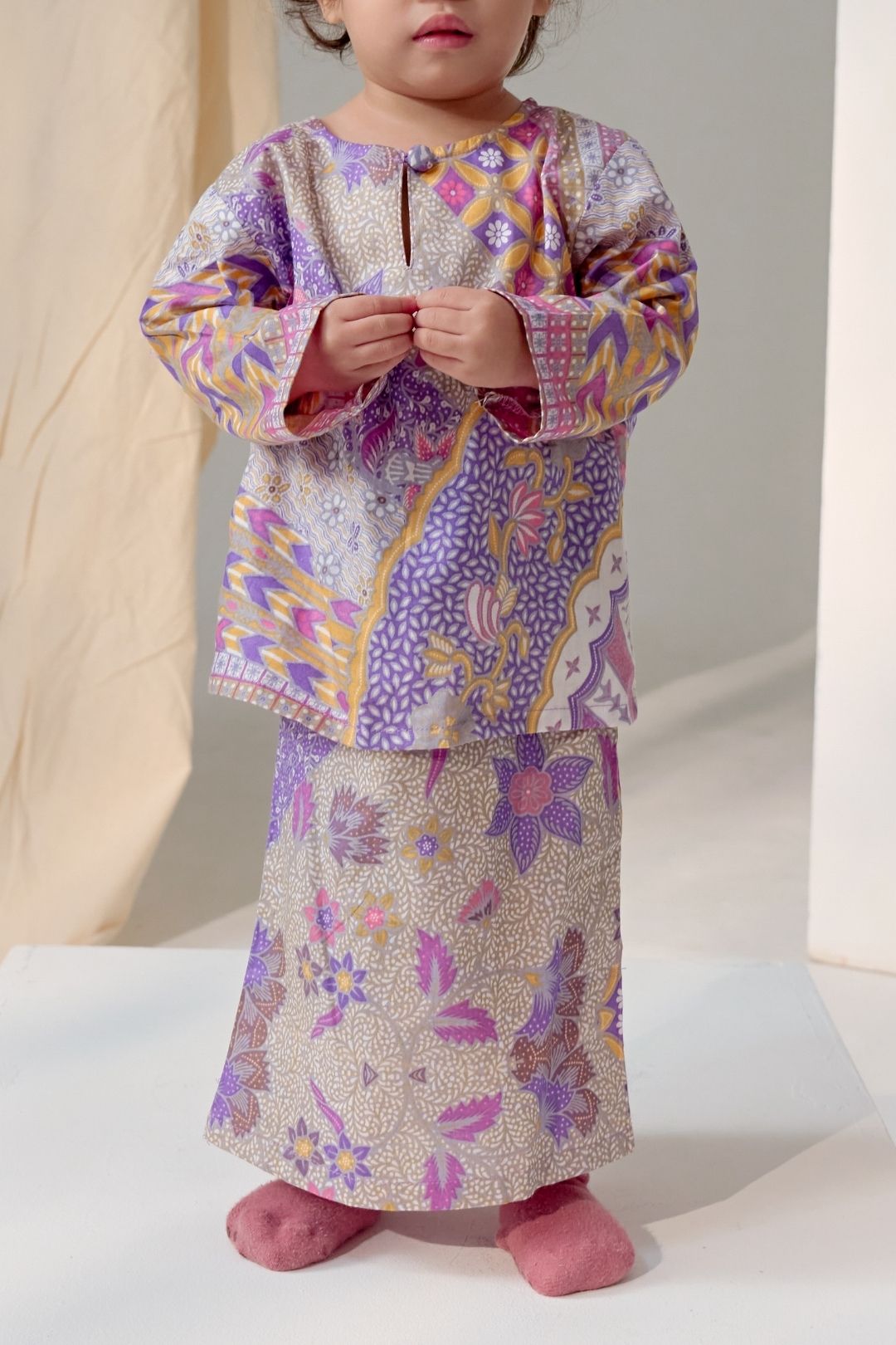 Featuring a classic kurung silhouette with a soft neckline and comfortable fit, it is paired with a matching skirt that allows for playful movement without compromising modesty. The delicate prints and harmonious colour palette create a timeless look, perfect for festive celebrations and special family moments.