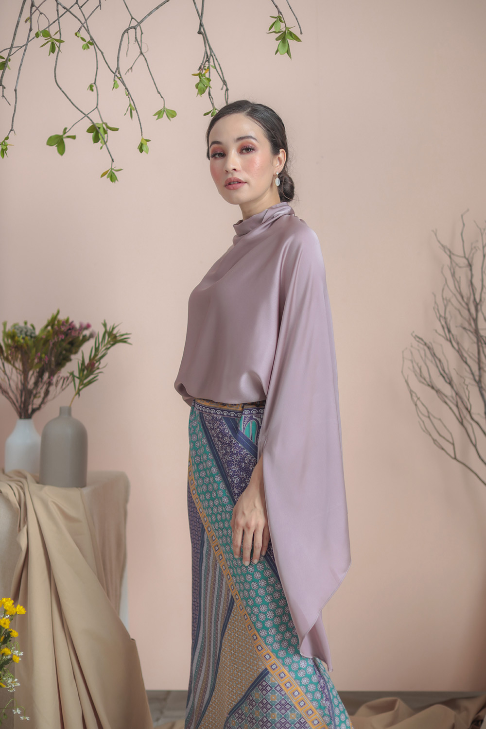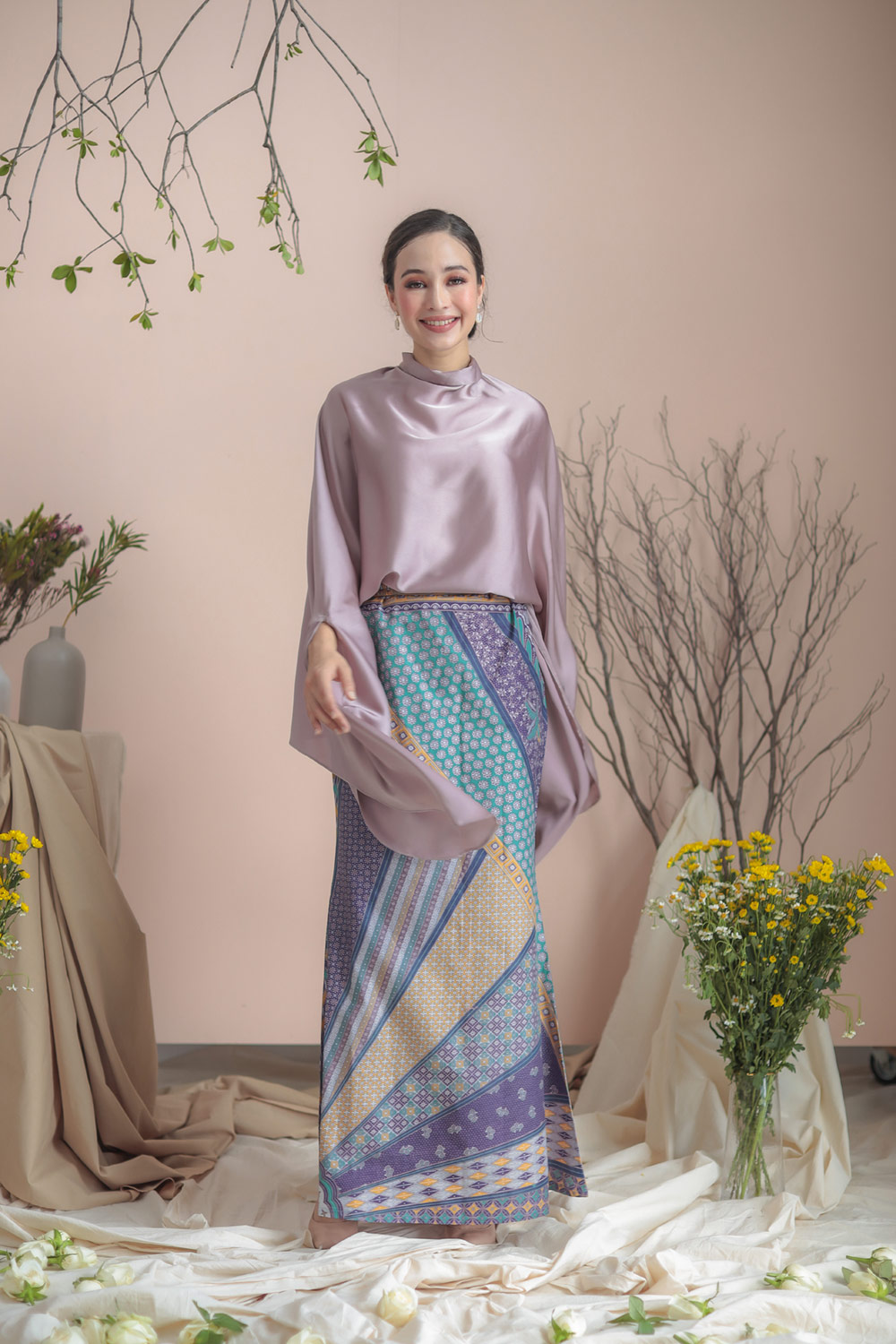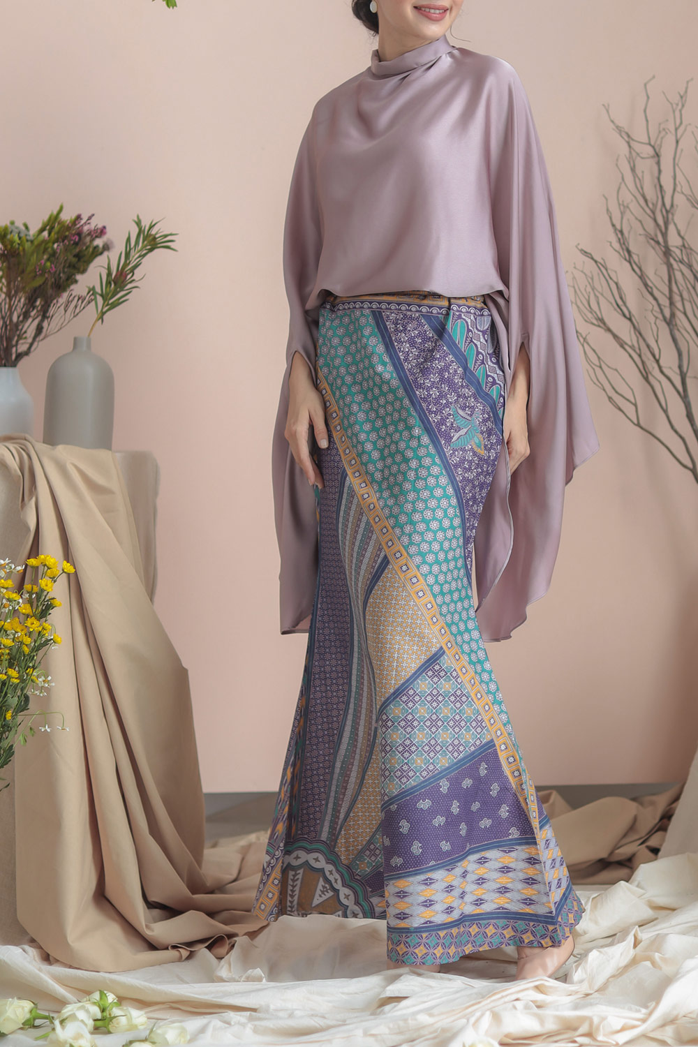 Batwing cut from a luxurious matte satin fabric with the perfect shades, this delicate caftan paired with mermaid-cut batik skirt will make you the most stunning person in the room on your Raya celebration. This Caftan Anggun set has a very loose fit, giving you all the comfort, yet will still flatter your figure!