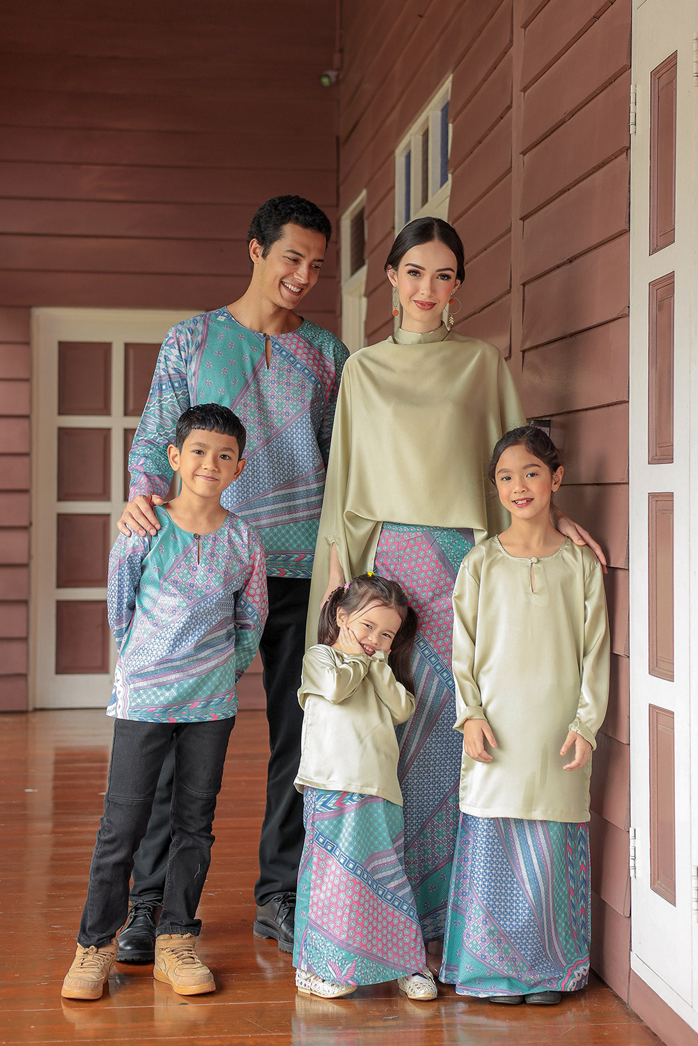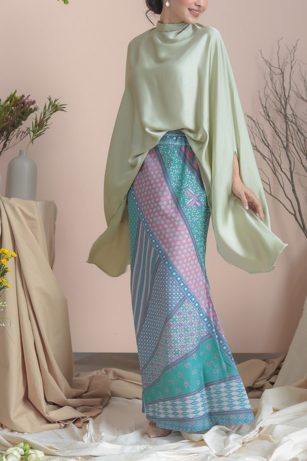 Batwing cut from a luxurious matte satin fabric with the perfect shades, this delicate caftan paired with mermaid-cut batik skirt will make you the most stunning person in the room on your Raya celebration. This Caftan Anggun set has a very loose fit, giving you all the comfort, yet will still flatter your figure!