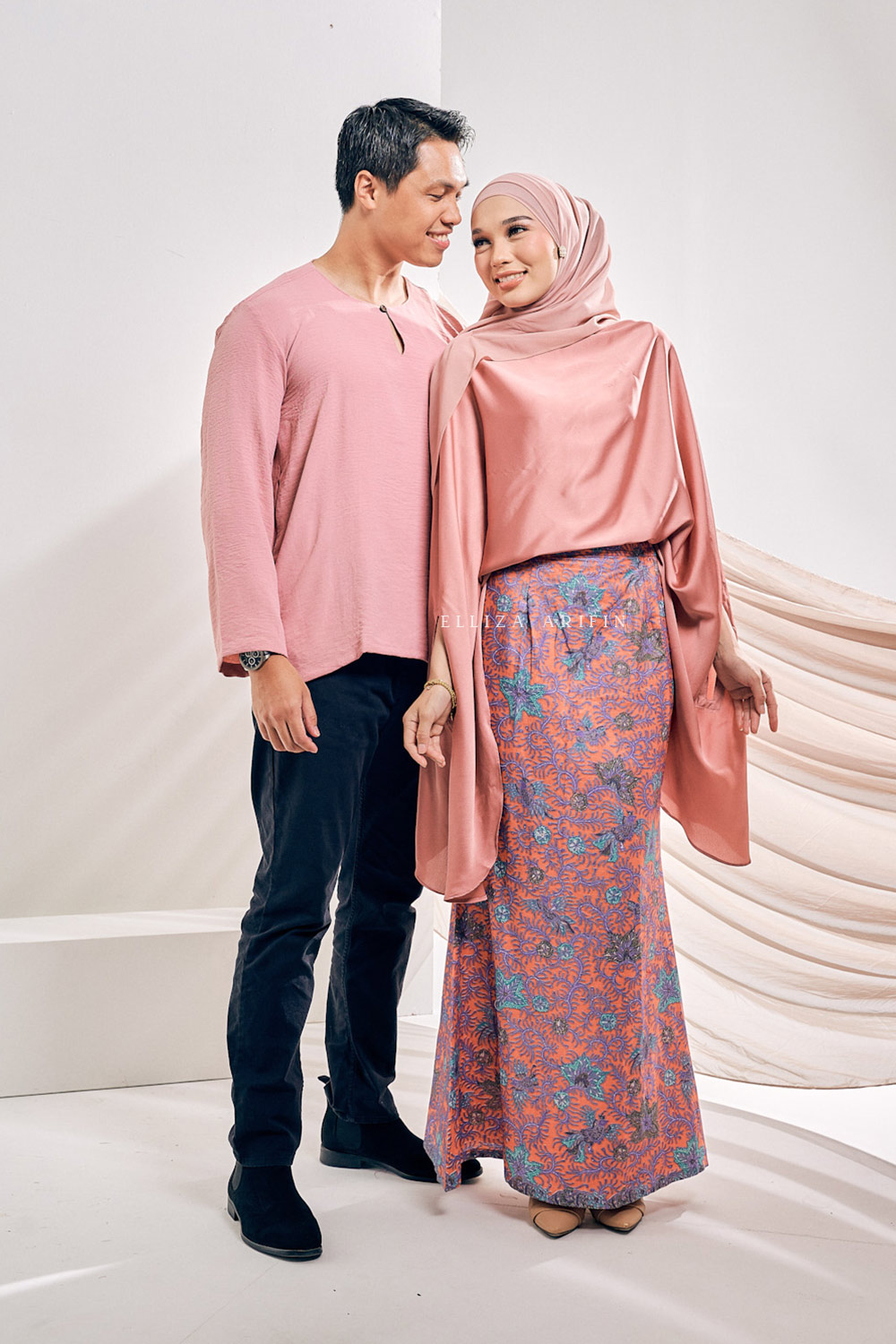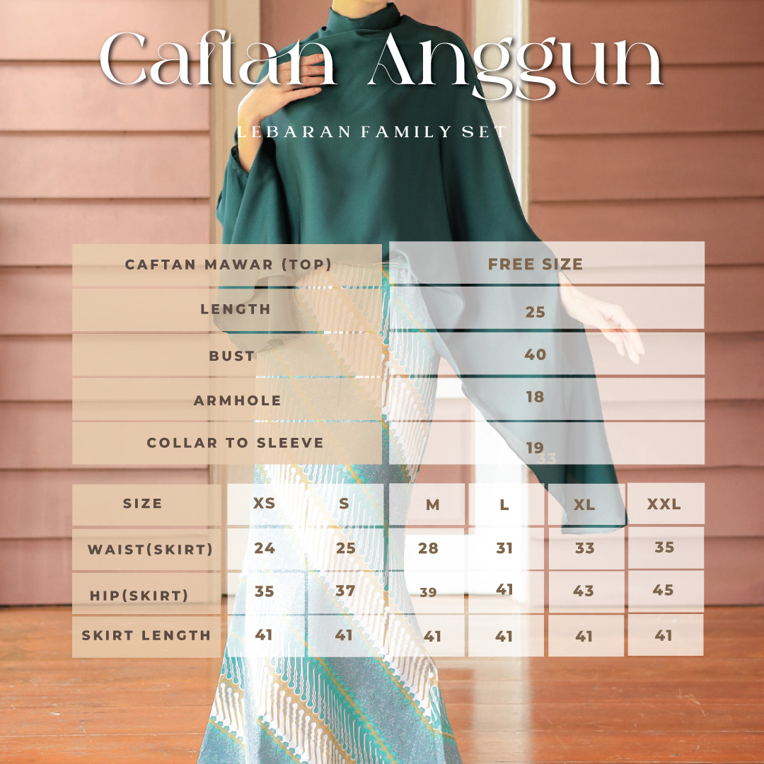 Batwing cut from a luxurious matte satin fabric with the perfect shades, this delicate caftan paired with mermaid-cut batik skirt will make you the most stunning person in the room on your Raya celebration. This cCaftan Anggun set has a very loose fit, giving you all the comfort, yet will still flatter your figure!
