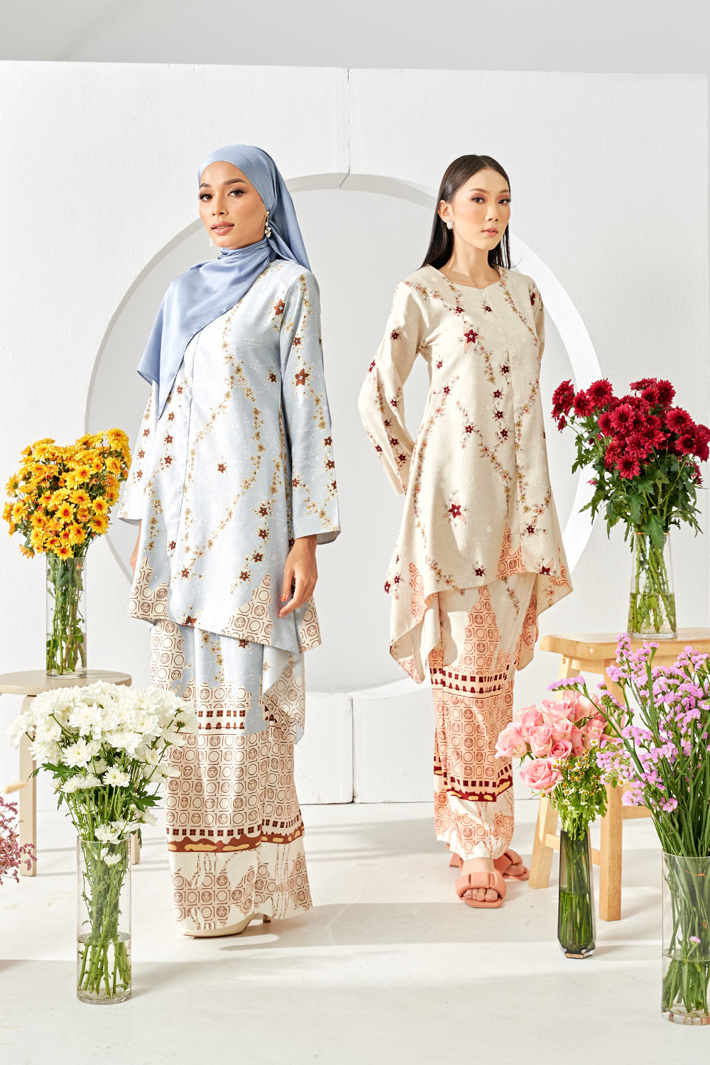 Carnation Kurung is made from soft, breathable and lightweight ironless dior silk. For the top of  comes with A-cutting and has a fit silhouette. It is available in 6 beautiful colours. The skirt is made of the same fabric and gently gathered so that it swings gently when you walk.
