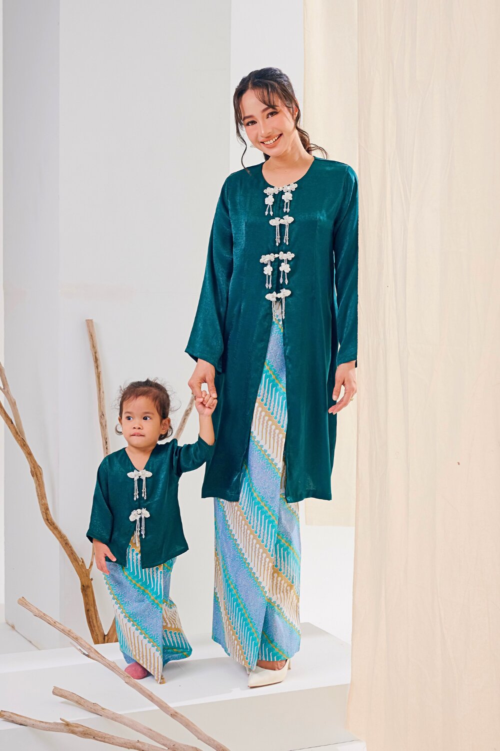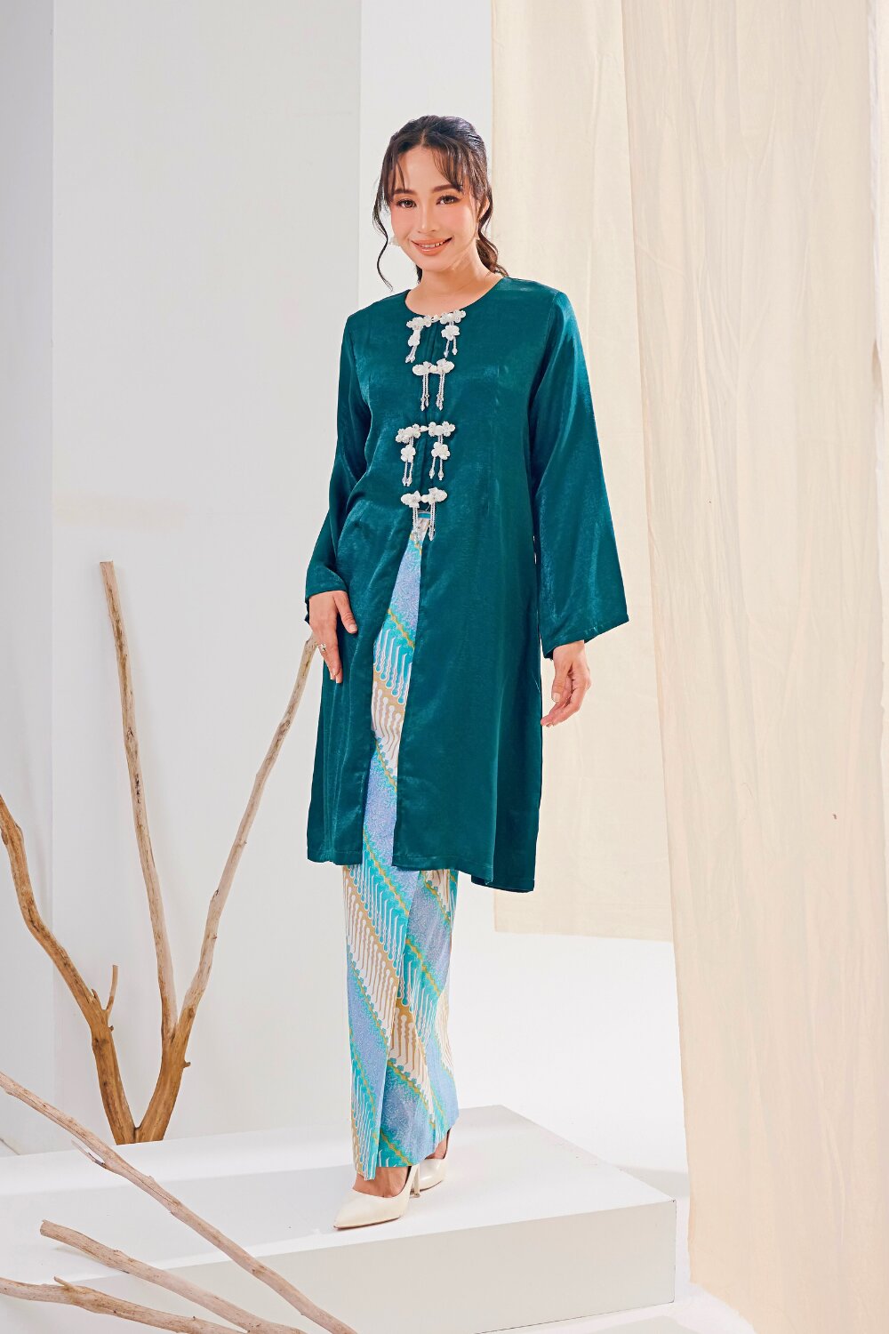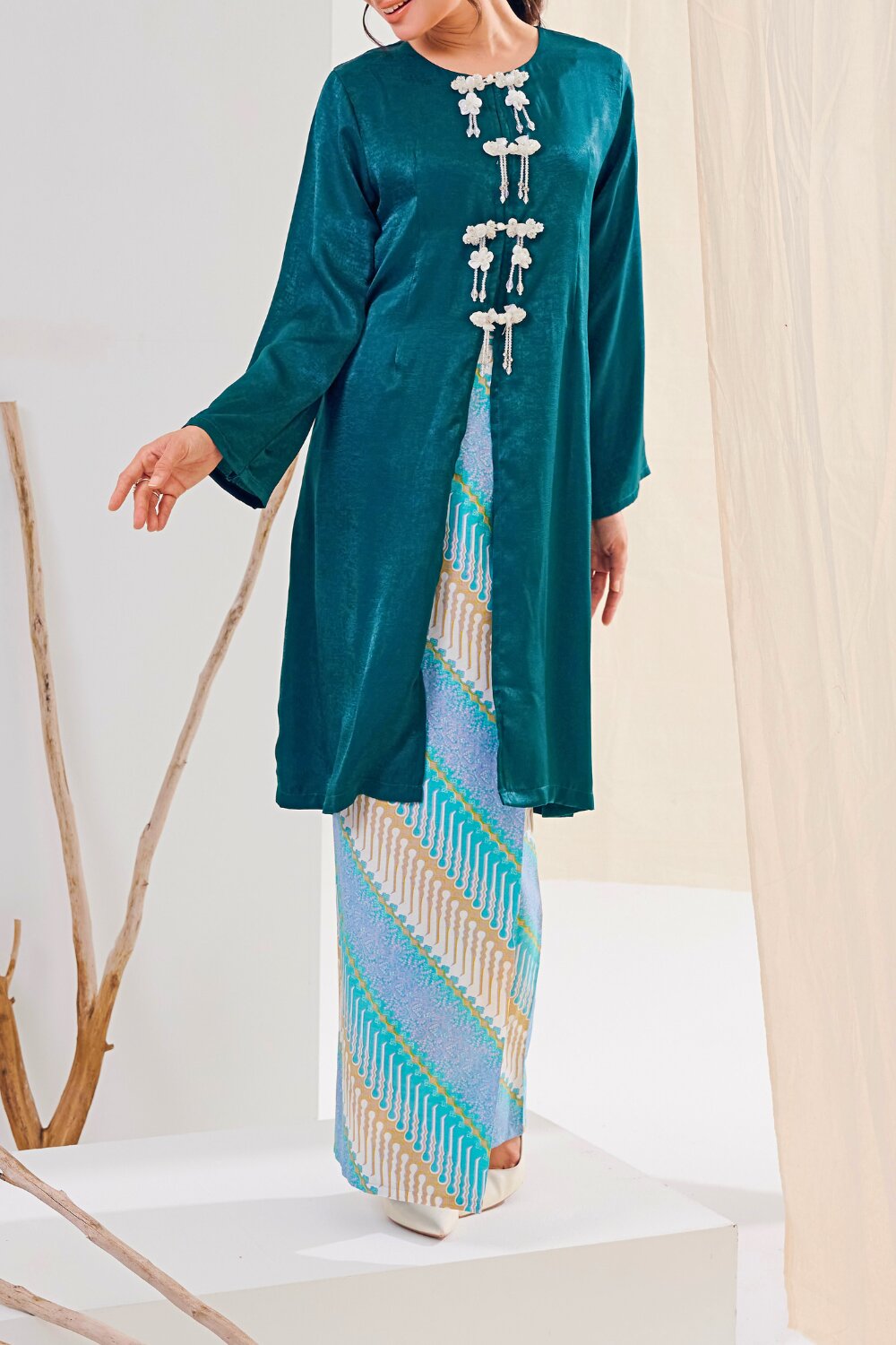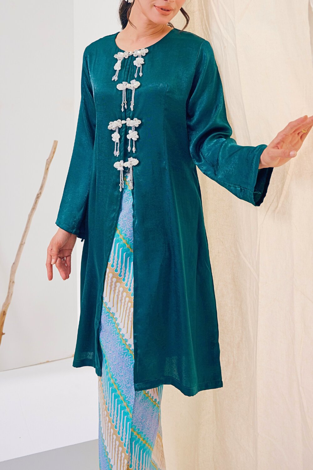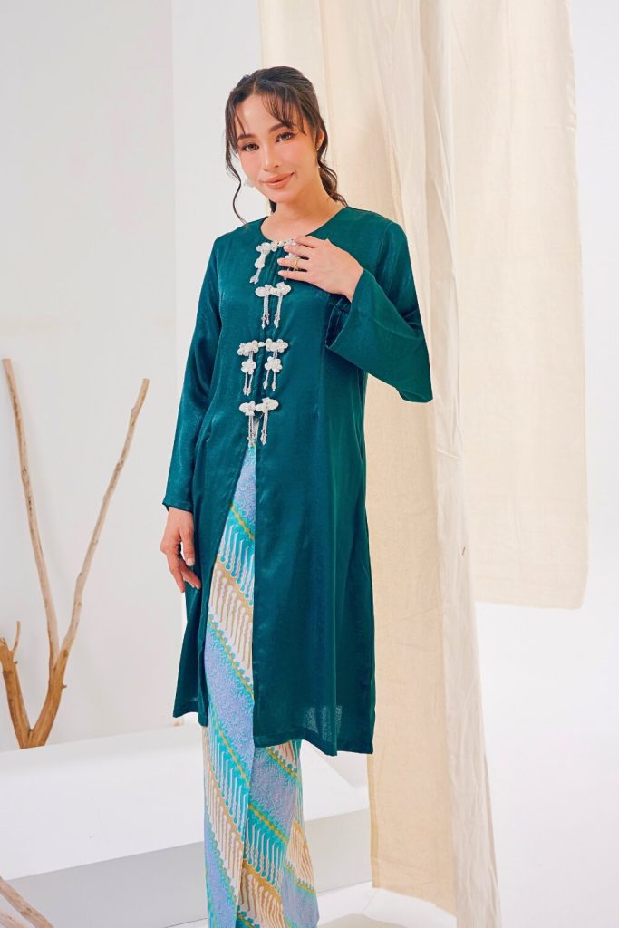 Crafted from a soft, flowy fabric with a subtle sheen, our Kabarung embodies refined femininity and effortless grace. The relaxed yet elegant cutting drapes beautifully along the silhouette, offering comfort while maintaining a polished look. Delicate crystal buttons adorn the front of the baju, adding a touch of understated sparkle that elevates the overall design.