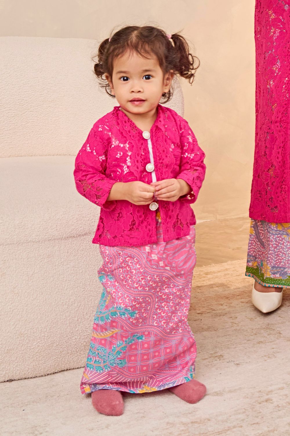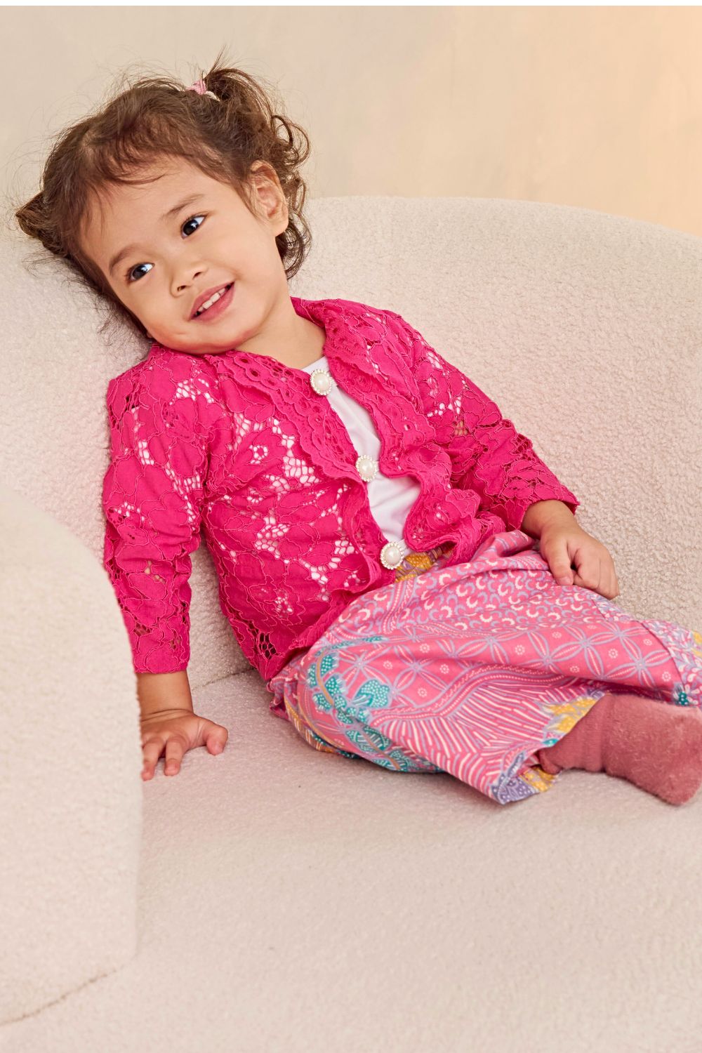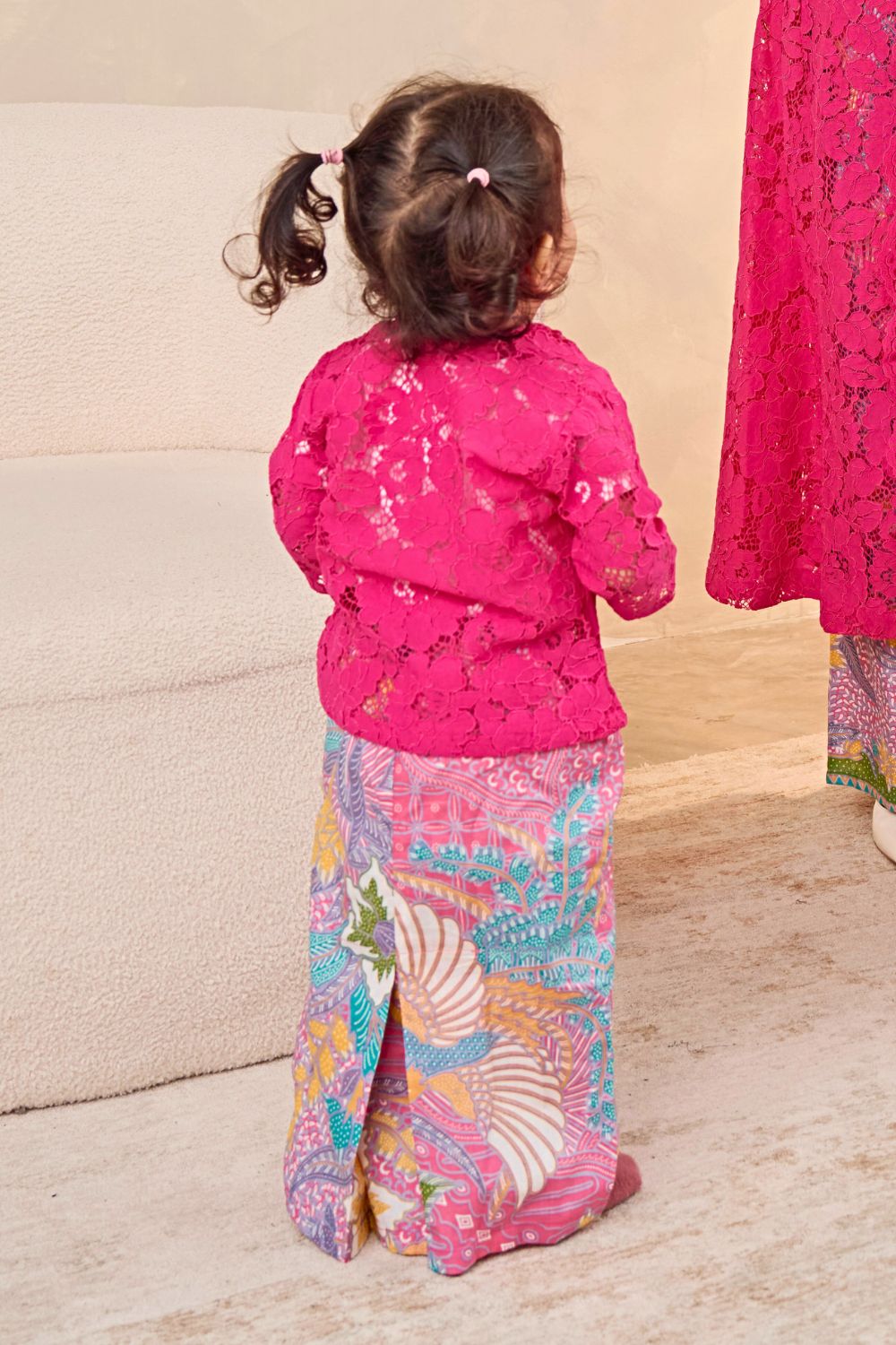 The intricate lace detailing adds a touch of sophistication, while the soft, breathable fabric ensures all-day comfort. Pair it with our vibrant batik skirts to complete the look — perfect for creating unforgettable matching moments with your children.