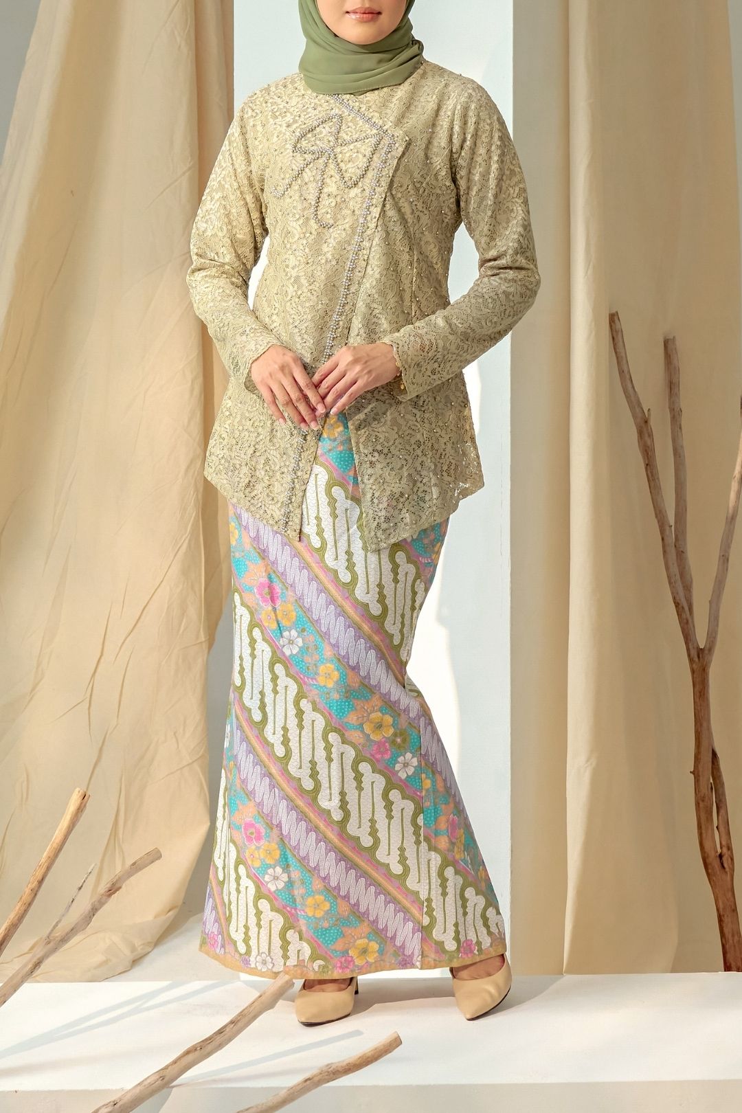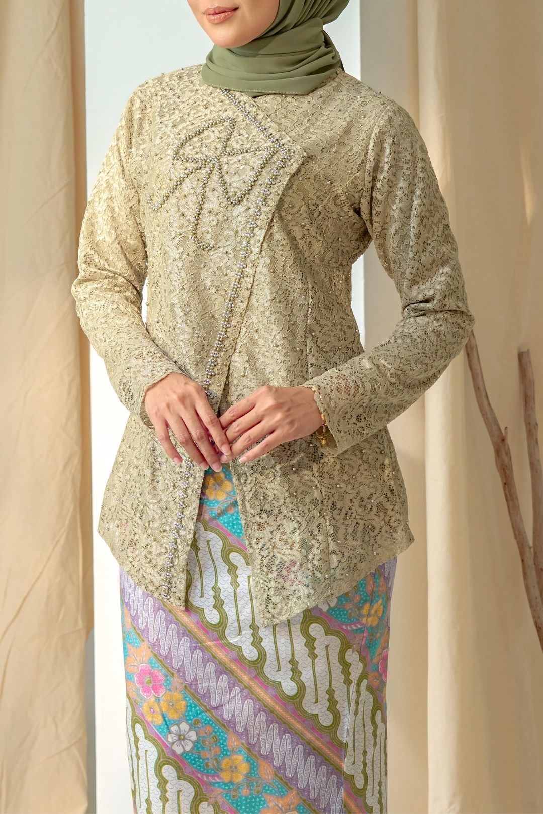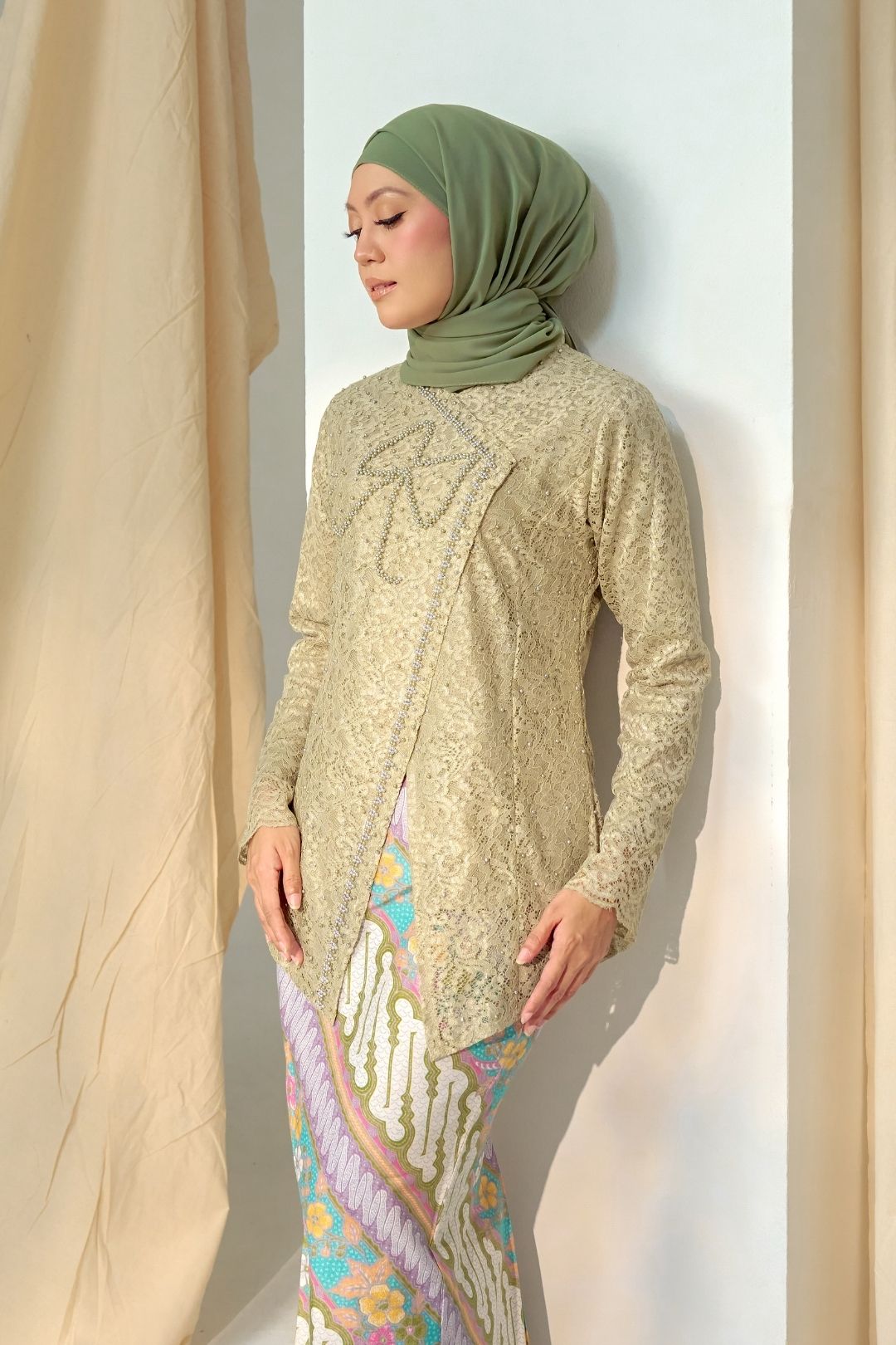 Designed with an asymmetrical janggan silhouette, this kebaya is enhanced with fine bead embellishment along the edges, adding a subtle shimmer while maintaining a graceful structure. Paired beautifully with kain or songket, it offers a timeless look suitable for festive celebrations and special occasions.A perfect balance of tradition and contemporary charm — elegant, feminine, and effortlessly refined.