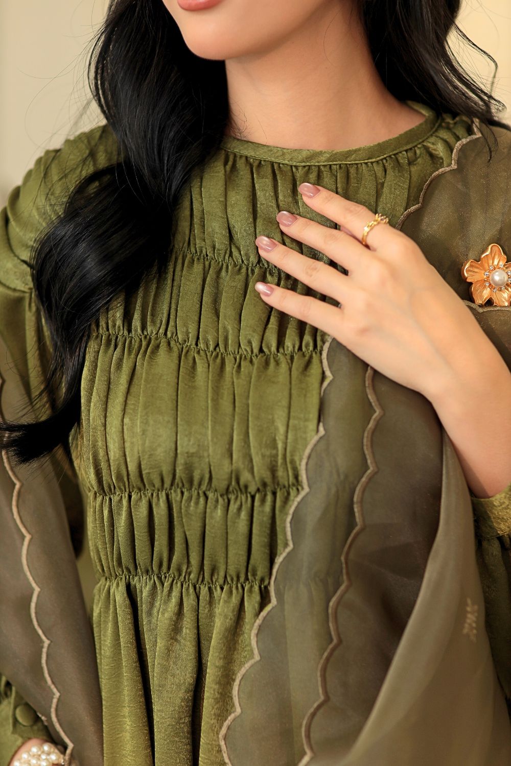 Paired with a matching skirt crafted from smooth, comfortable material, the outfit falls neatly when worn, creating a polished yet effortless look. The coordinated prints and soft colour palette give it a timeless festive feel — perfect for family gatherings, celebrations, and capturing beautiful moments together.