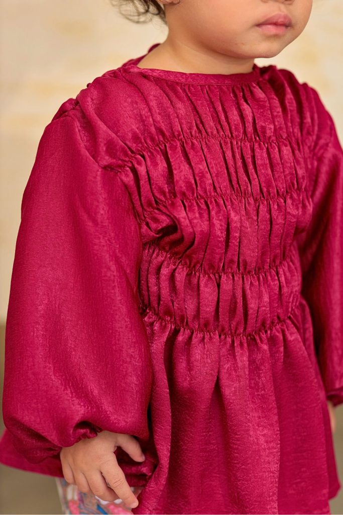Paired with a matching skirt crafted from smooth, comfortable material, the outfit falls neatly when worn, creating a polished yet effortless look. The coordinated prints and soft colour palette give it a timeless festive feel — perfect for family gatherings, celebrations, and capturing beautiful moments together.