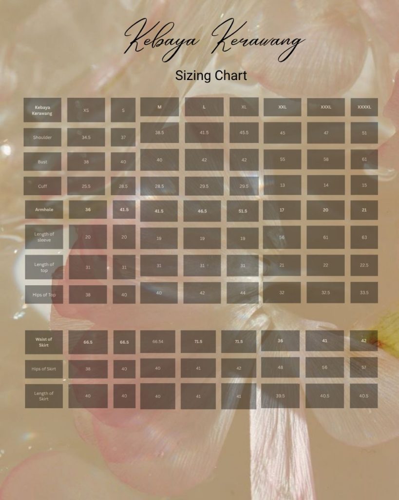 | Kebaya Kerawang (CM) | XS | S | M | L | XL |