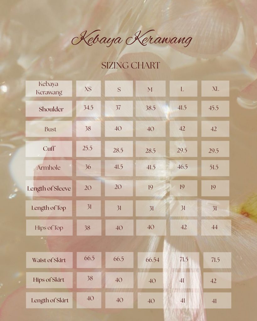 | Kebaya Kerawang (CM) | XS | S | M | L | XL |