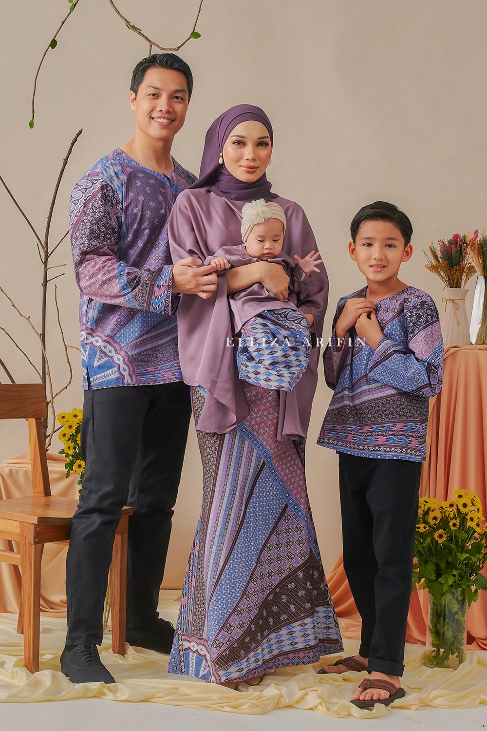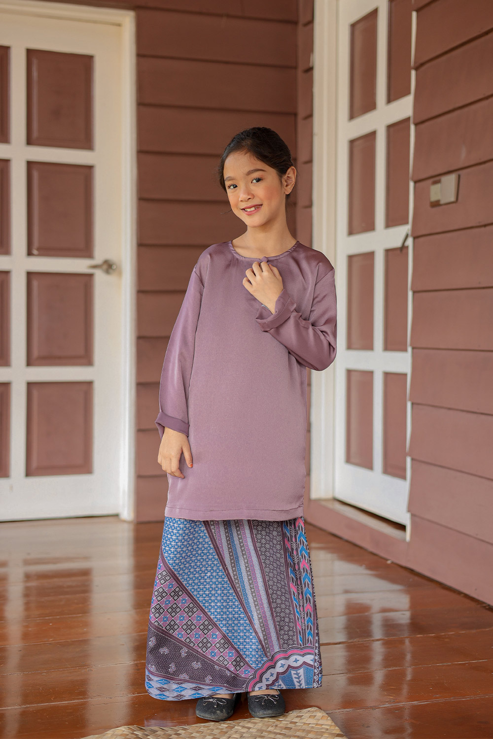 Straight cut from a luxurious matte satin fabric with the perfect shades, this delicate caftan paired with mermaid-cut batik skirt will make you the most stunning person in the room on your Raya celebration. This Kurung Anggun Kids set has a very loose fit, giving you all the comfort, yet will still flatter your figure!