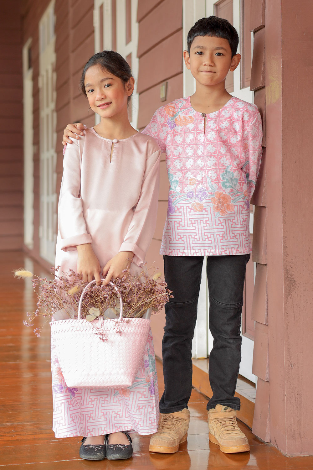 Straight cut from a luxurious matte satin fabric with the perfect shades, this delicate caftan paired with mermaid-cut batik skirt will make you the most stunning person in the room on your Raya celebration. This Kurung Anggun Kids set has a very loose fit, giving you all the comfort, yet will still flatter your figure!