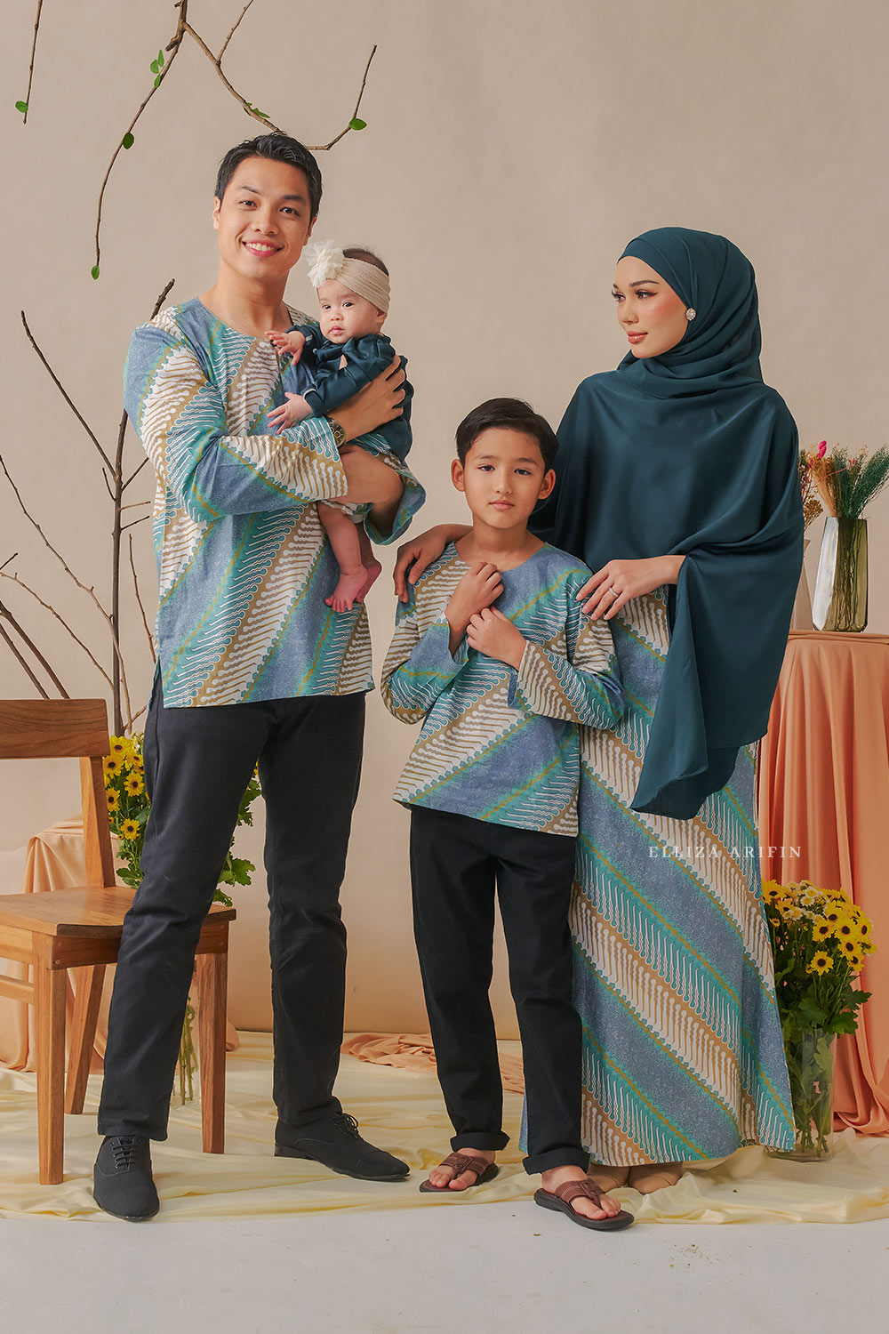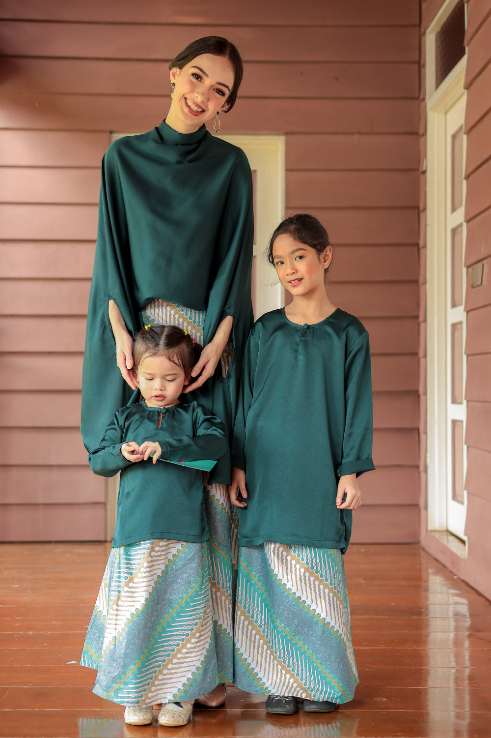 Straight cut from a luxurious matte satin fabric with the perfect shades, this delicate caftan paired with mermaid-cut batik skirt will make you the most stunning person in the room on your Raya celebration. This Kurung Anggun Kids set has a very loose fit, giving you all the comfort, yet will still flatter your figure!